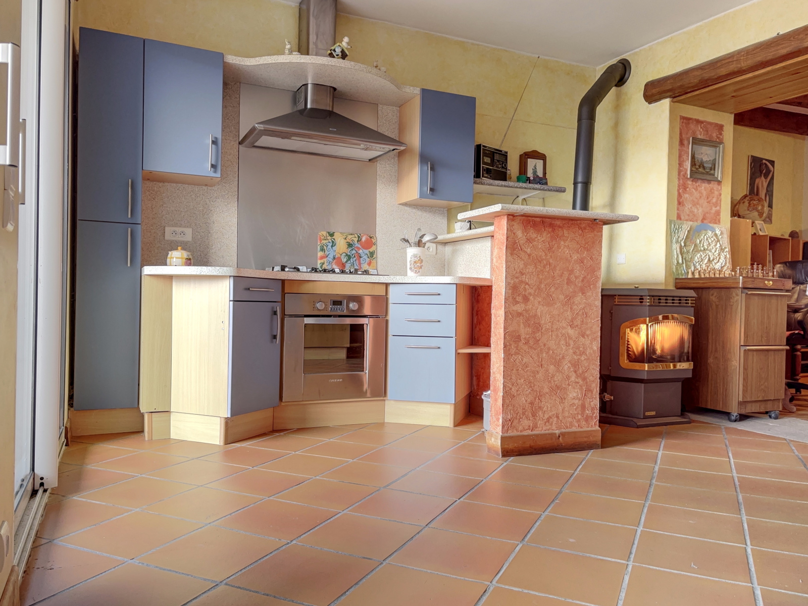 Chauffage : Partie locative : radiateurs électriques / Partie privée : poêle à granulés bois / Cheminée Ouverte