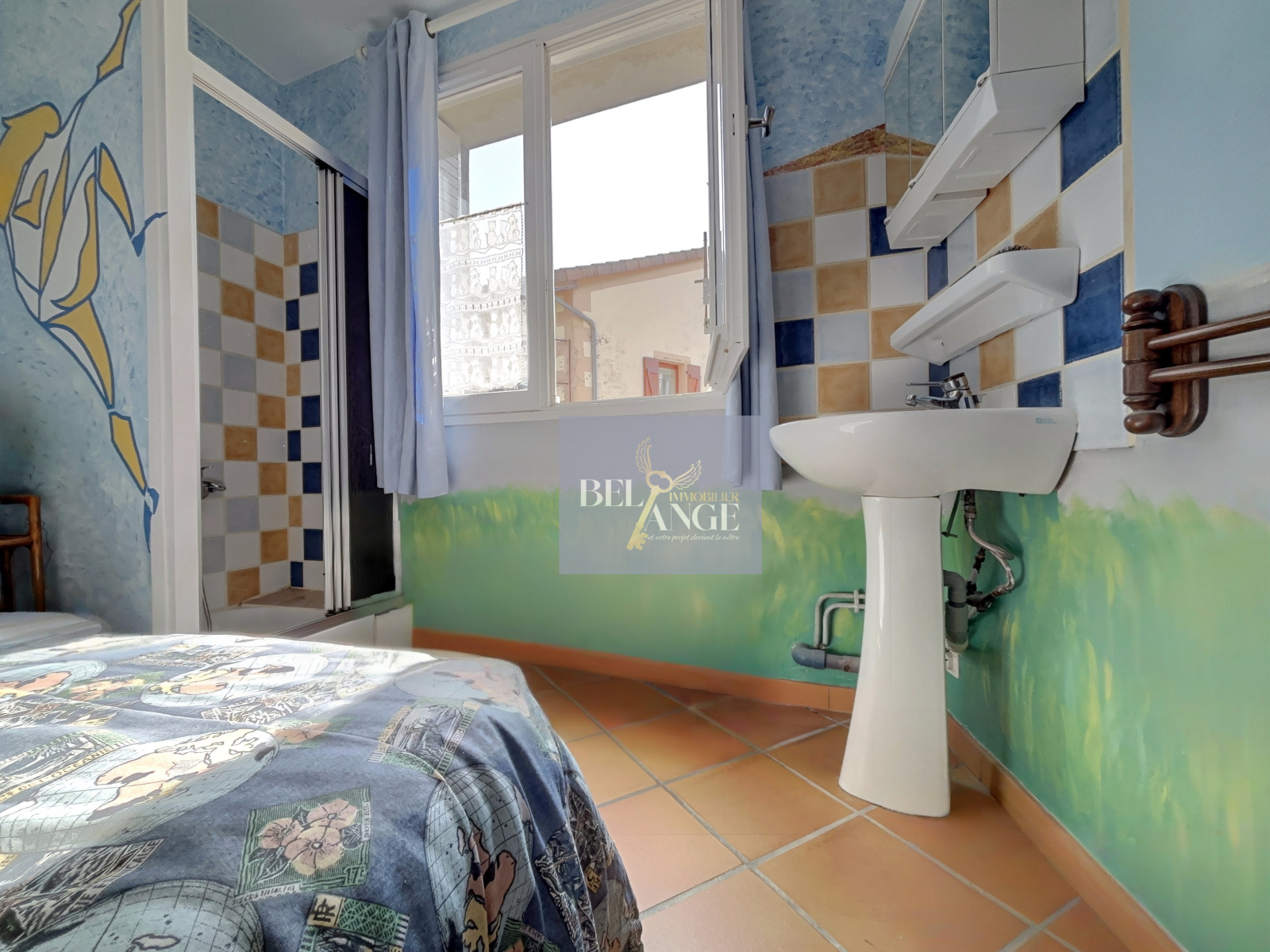 Une chambre avec douche et lavabo, salle d’eau, WC, cellier.